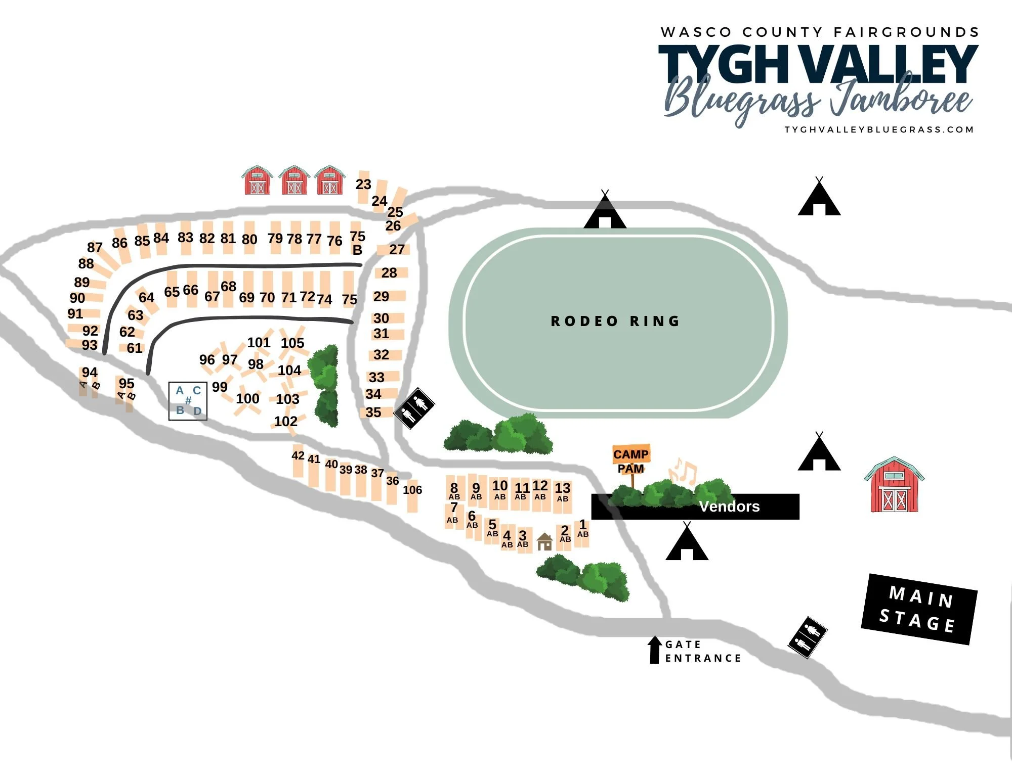 The Tygh Valley Bluegrass Jamboree is held in beautiful Tygh Valley, Oregon at the Wasco County Fairgrounds. There are two large restroom facilities located at the Fairgrounds with proper plumbing. Each facility also has a number of coin-operated showers, too. There are plenty of RV spots and tent/car camping options for you to choose from.