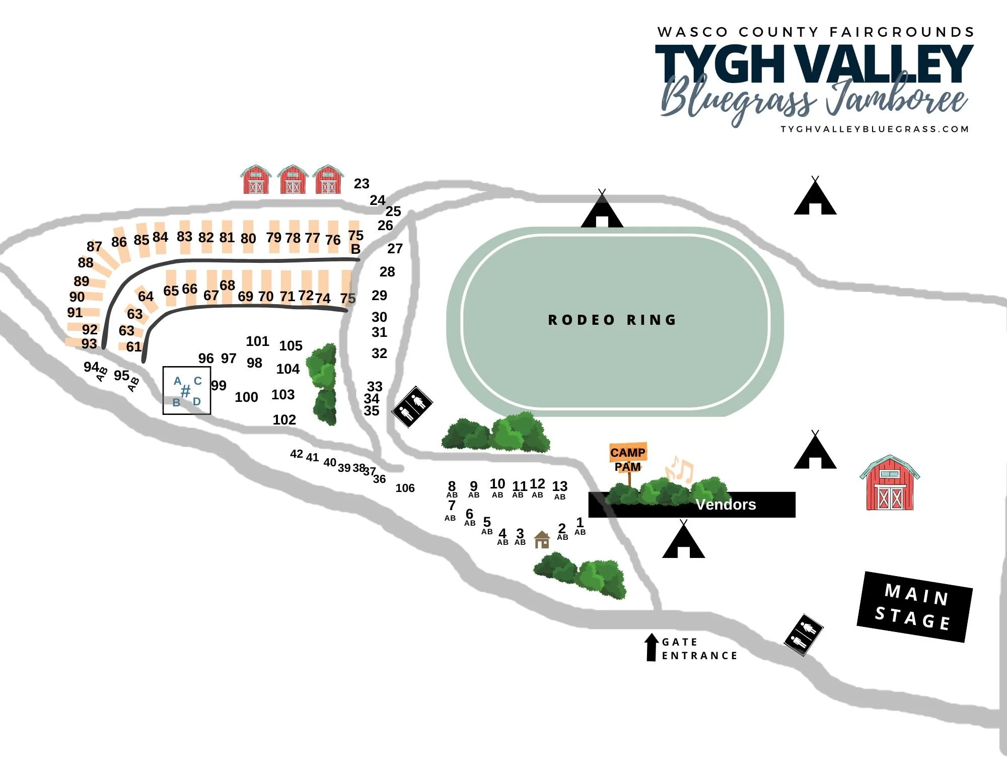 Note: Wasco County Fairgrounds has just completed a huge electric and design upgrade. Some spot numbers have changed — and all sites now have RV plugs.
